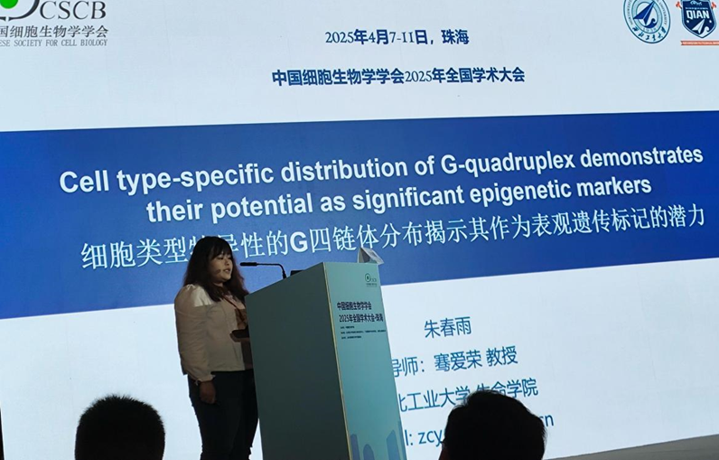 骞爱荣教授作报告 博士研究生朱春雨受邀参加大会研究生论坛,并作英文报告,题为“细胞类型特异性的G四链体分布揭示其作为表观遗传标记的潜力”,展示了课题组在G-四链体结构研究方面的前沿成果,并分享了相关技术研发的新进展。